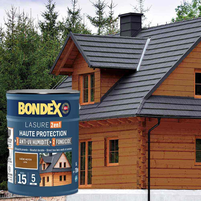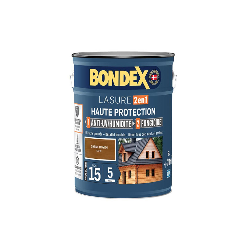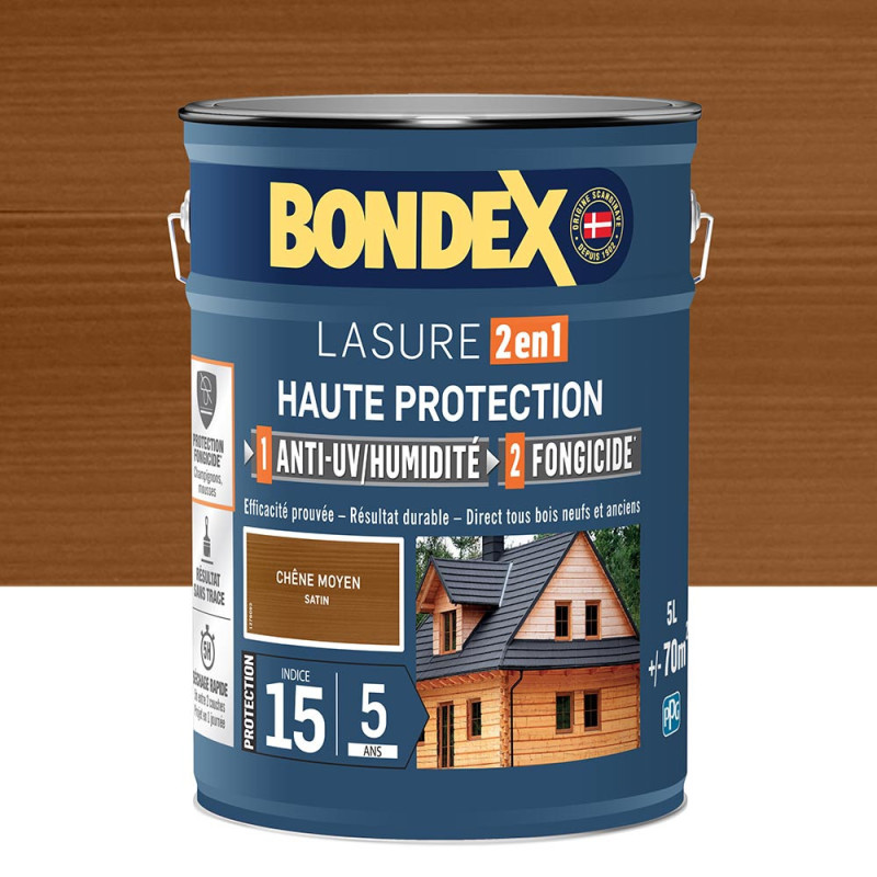 La lasure Bondex 2 en 1 haute protection est garantie 5 ans contre les UV, les intempéries, les écarts de températures les champignons et les insectes. De couleur chêne moyen et à l'aspect satin, elle viendra entretenir vos boiseries. Elle est idéale pour la protection et la décoration de la surface des bois bruts, anciens ou lasurés. Direct tous bois neufs et anciens. Formule onctueuse anti-goutte, transparente, incolore ou teintée. Bonne pénétration produit dans le support grâce à la finesse des particules. Le film sec forme une barrière à la surface du bois empêchant la ponte des insectes. Fongicide encapsulé pour une libération progressive et continue de l’actif fongicide en fonction des contraintes climatiques telles que pluie, brouillard, rosée (protection fongicide en surface du film sec contre le développement des champignons).