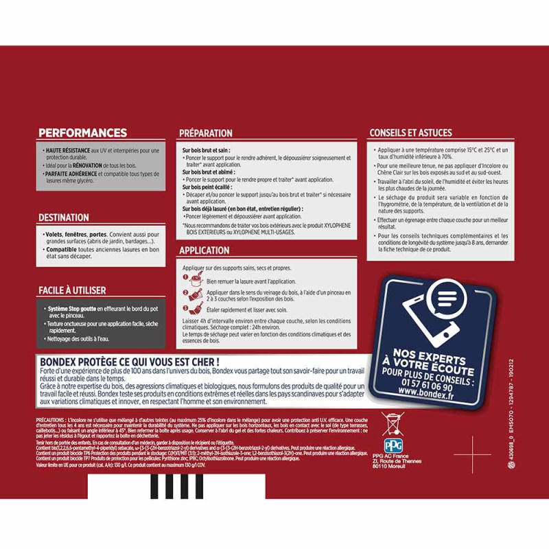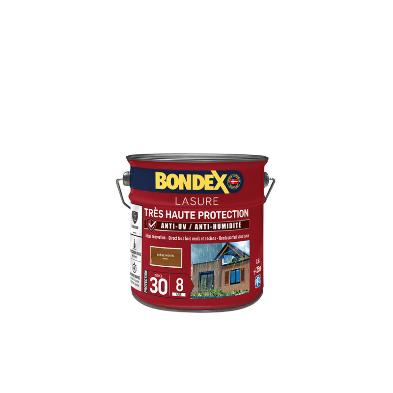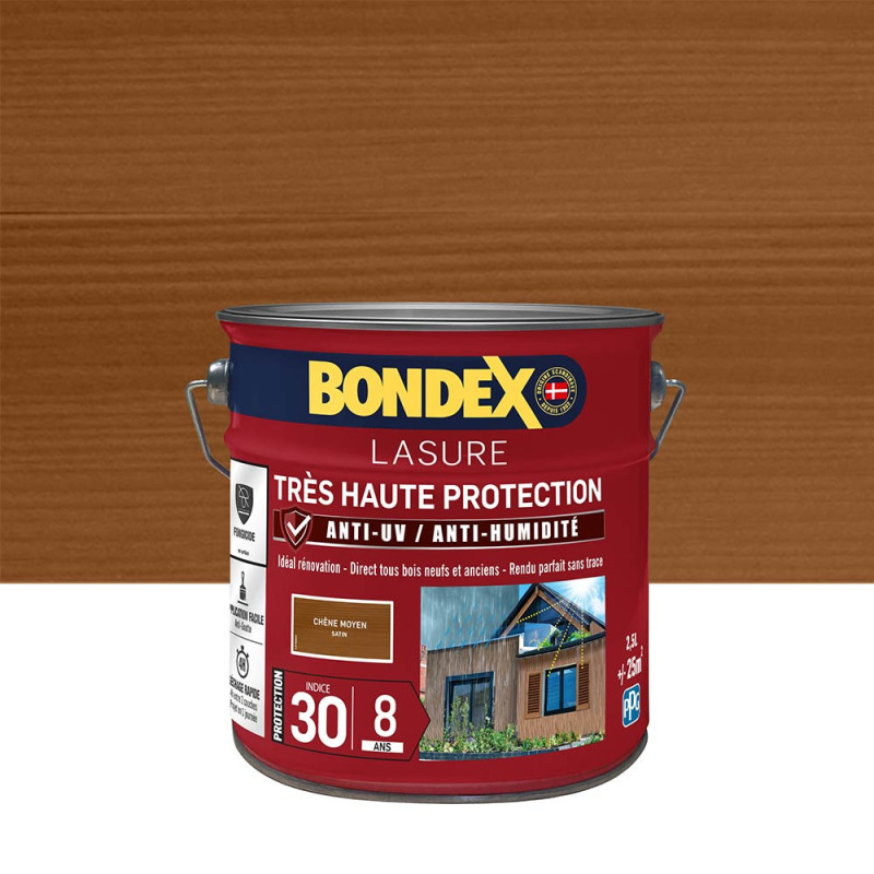La lasure Bondex 2 en 1 très haute protection est garantie 8 ans contre les UV, les intempéries, les écarts de températures les champignons et les insectes. De couleur chêne moyen et à l'aspect satin, elle viendra entretenir vos boiseries. Elle est idéale pour la protection et la décoration de la surface des bois bruts, anciens ou lasurés. Direct tous bois neufs et anciens. Formule onctueuse anti-goutte, transparente, incolore ou teintée. Bonne pénétration produit dans le support grâce à la finesse des particules. Le film sec forme une barrière à la surface du bois empêchant la ponte des insectes. Fongicide encapsulé pour une libération progressive et continue de l’actif fongicide en fonction des contraintes climatiques telles que pluie, brouillard, rosée (protection fongicide en surface du film sec contre le développement des champignons).