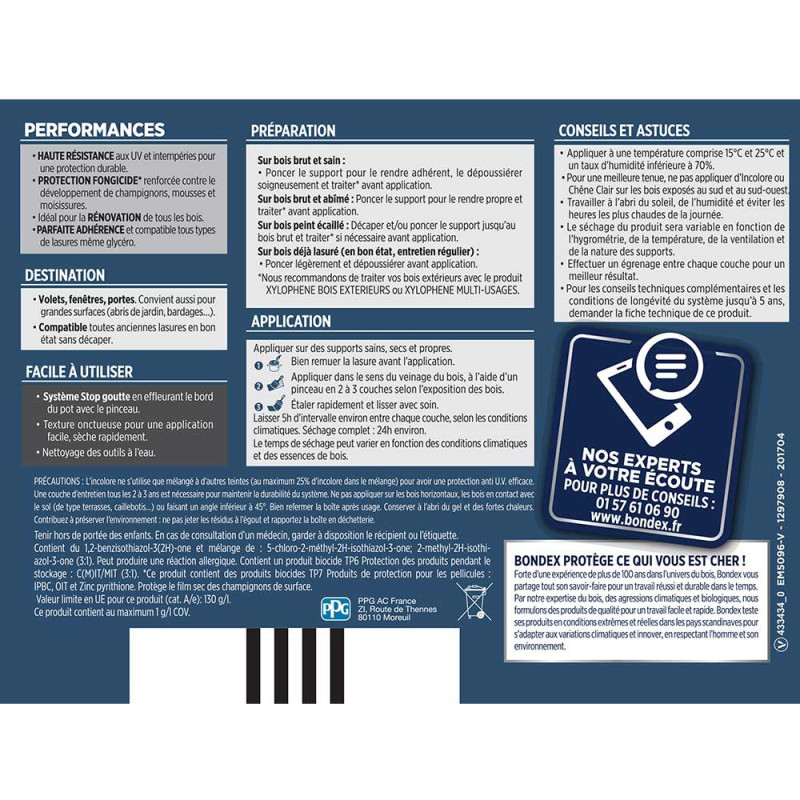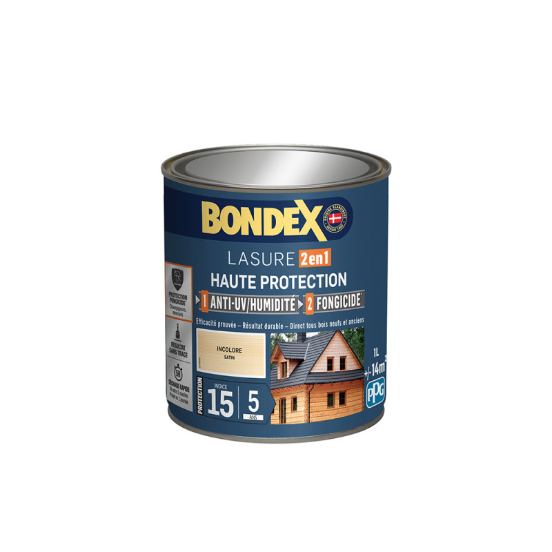 La lasure Bondex 2 en 1 haute protection est garantie 5 ans contre les UV, les intempéries, les écarts de températures les champignons et les insectes. De couleur incolore et à l'aspect satin, elle viendra entretenir vos boiseries. Elle est idéale pour la protection et la décoration de la surface des bois bruts, anciens ou lasurés. Direct tous bois neufs et anciens. Formule onctueuse anti-goutte, transparente, incolore ou teintée. Bonne pénétration produit dans le support grâce à la finesse des particules. Le film sec forme une barrière à la surface du bois empêchant la ponte des insectes. Fongicide encapsulé pour une libération progressive et continue de l’actif fongicide en fonction des contraintes climatiques telles que pluie, brouillard, rosée (protection fongicide en surface du film sec contre le développement des champignons).