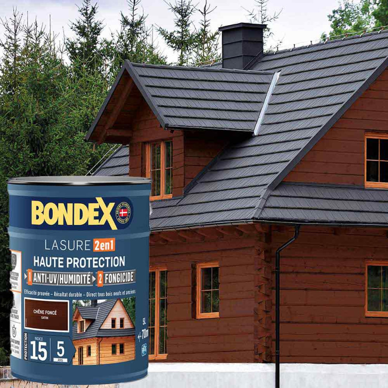 La lasure Bondex 2 en 1 haute protection est garantie 5 ans contre les UV, les intempéries, les écarts de températures les champignons et les insectes. De couleur chêne foncé et à l'aspect satin, elle viendra entretenir vos boiseries. Elle est idéale pour la protection et la décoration de la surface des bois bruts, anciens ou lasurés. Direct tous bois neufs et anciens. Formule onctueuse anti-goutte, transparente, incolore ou teintée. Bonne pénétration produit dans le support grâce à la finesse des particules. Le film sec forme une barrière à la surface du bois empêchant la ponte des insectes. Fongicide encapsulé pour une libération progressive et continue de l’actif fongicide en fonction des contraintes climatiques telles que pluie, brouillard, rosée (protection fongicide en surface du film sec contre le développement des champignons).