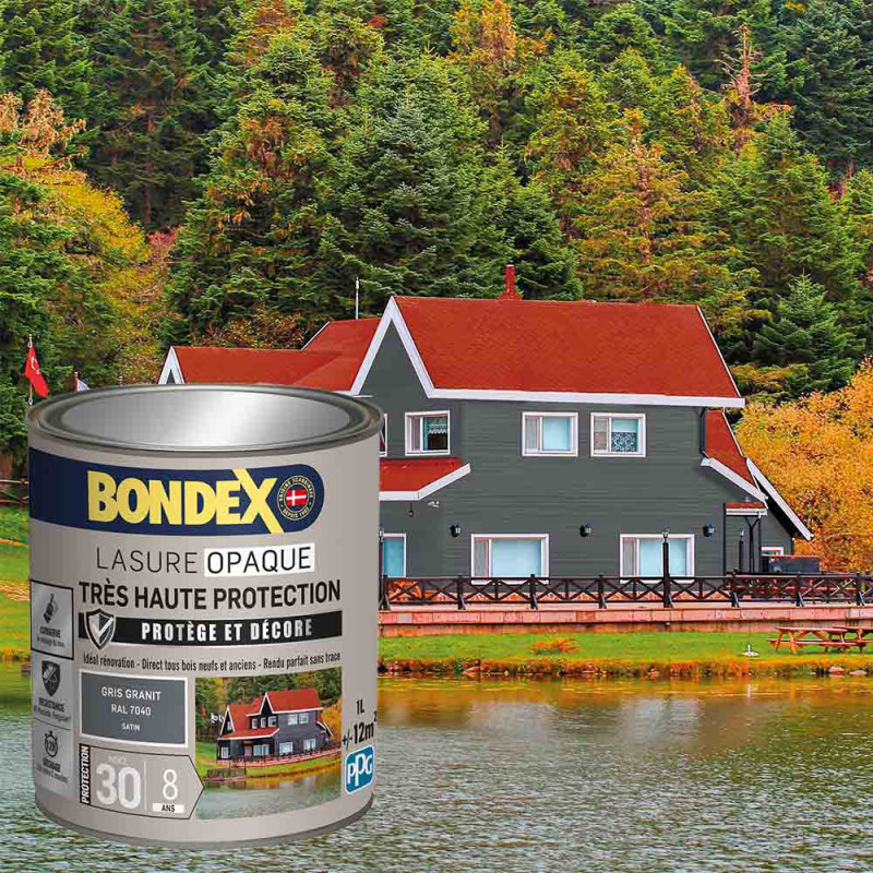 La lasure Bondex 2 en 1 opaque très haute protection est garantie 8 ans contre les UV, les intempéries, les écarts de températures les champignons et les insectes. De couleur gris granit et à la finition satin elle viendra entretenir vos boiseries. Elle est idéale pour la protection et la décoration de la surface des bois bruts, anciens ou lasurés. Direct tous bois neufs et anciens. Formule onctueuse anti-goutte, transparente, incolore ou teintée. Bonne pénétration produit dans le support grâce à la finesse des particules. Le film sec forme une barrière à la surface du bois empêchant la ponte des insectes. Fongicide encapsulé pour une libération progressive et continue de l’actif fongicide en fonction des contraintes climatiques telles que pluie, brouillard, rosée (protection fongicide en surface du film sec contre le développement des champignons).