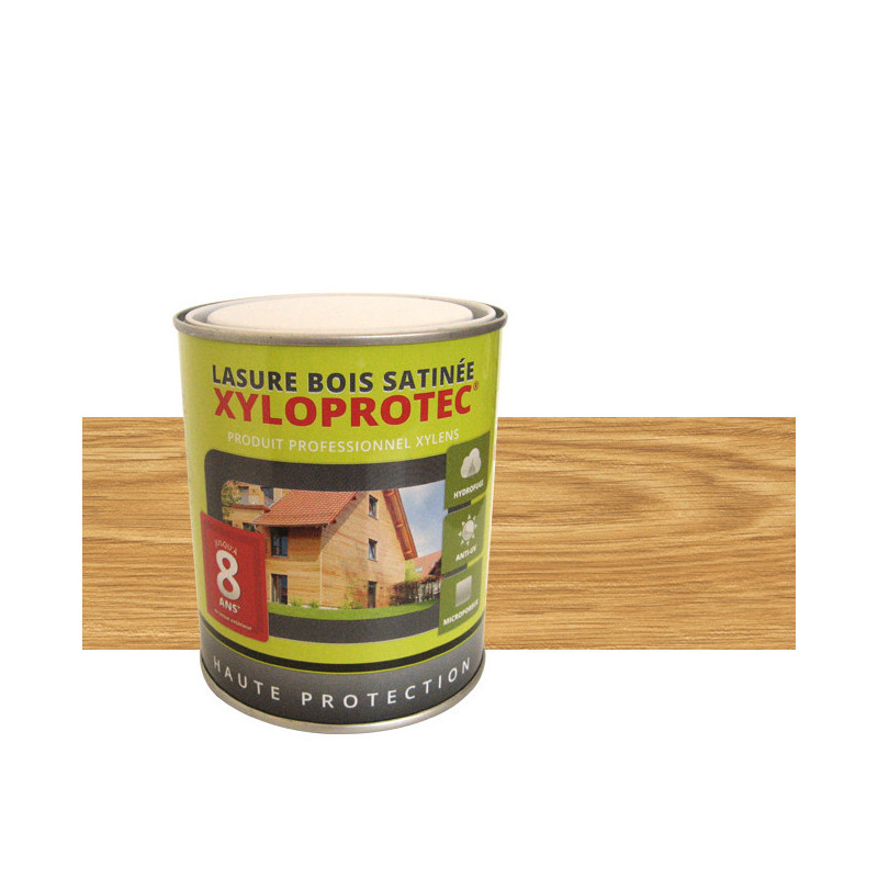 Lasure bois satinée Xyloprotech Haute Protection de couleur chêne clair garantie 8 ans est formulée à base de résine alkydes et de solvant. Microporeuse, fongicide du film et hydrofuge à utiliser sur des supports sains. Cette lasure contient un double système agents anti UV qui offre un écran protecteur renforcé et la rend plus résistante les varirations de températures. Nous vous recommandons d'appliquer 3 couches pour renforcer sa tenue dans le temps.