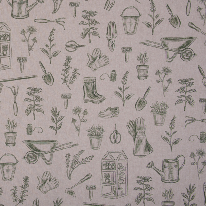 Tissu toile outils de jardin vert et beige – Largeur 140 cm