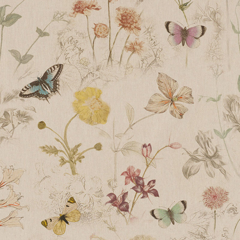 Tissu toile floral et papillon multicolore et beige 140 cm