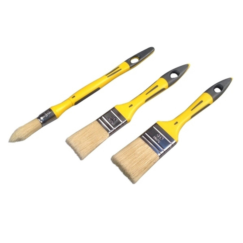 Ce lot de 3 pinceaux haute qualité est idéal pour tous types de peintures, qu'elles soient acryliques ou glycéro. Il comprend : 1 pinceau plat 30 mm, 1 pinceau plat 50 mm et 1 pinceau rond à rechampir N°3/0 (Ø 15 mm), parfait pour les travaux de précision (angles, bordures, fenêtres, moulures). Les manches bi-injection offrent une prise en main confortable, et les viroles inox assurent une bonne durabilité sans risque de rouille. Présentés en pochette, ces pinceaux polyvalents garantissent une finition soignée sur toutes les surfaces.