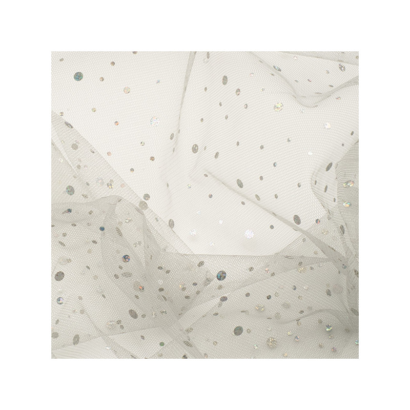 Tissu maille en tulle coloris gris argent à paillettes en largeur 150 cm. Ce modèle sera idéal pour les loisirs créatifs ou la confection...