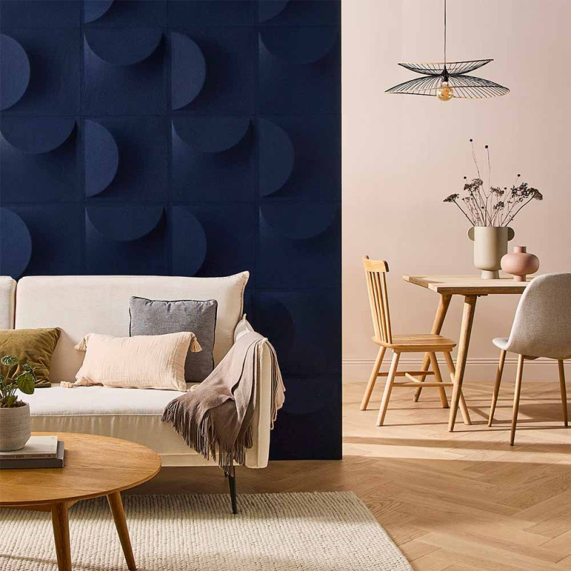 Apportez une touche de raffinement et de profondeur à votre intérieur avec ce panneau mural 3D en feutrine bleu nuit. Son effet en relief joue avec la lumière pour créer un design unique et sophistiqué, parfait pour une décoration contemporaine. Ce panneau pour former une tête de lit est léger et facile à poser, il se fixe par simple collage, en disposition horizontale ou verticale, offrant une grande liberté de création. Idéal pour la maison ou le bureau, ce panneau transforme vos murs en éléments décoratifs élégants et acoustiquement confortables.
