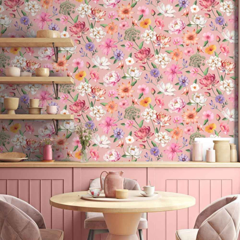 Papier peint intissé floral fond rose UGEPA