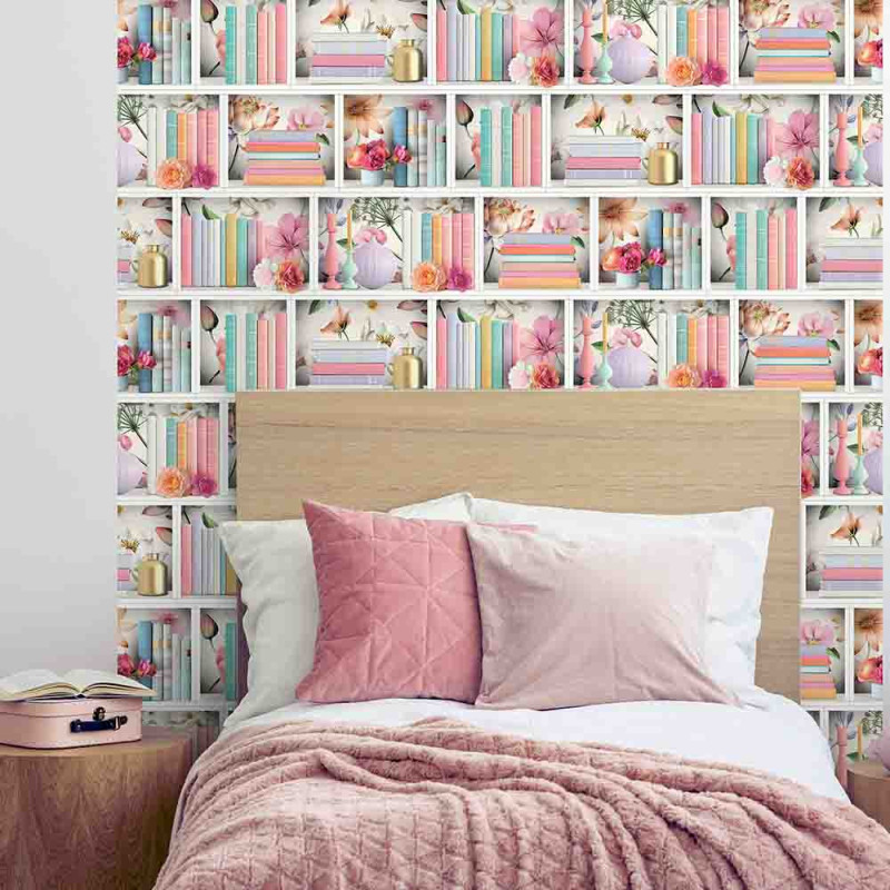 Apportez charme et douceur à votre intérieur avec ce papier peint intissé à motif étagère florale rose signé