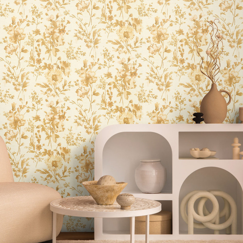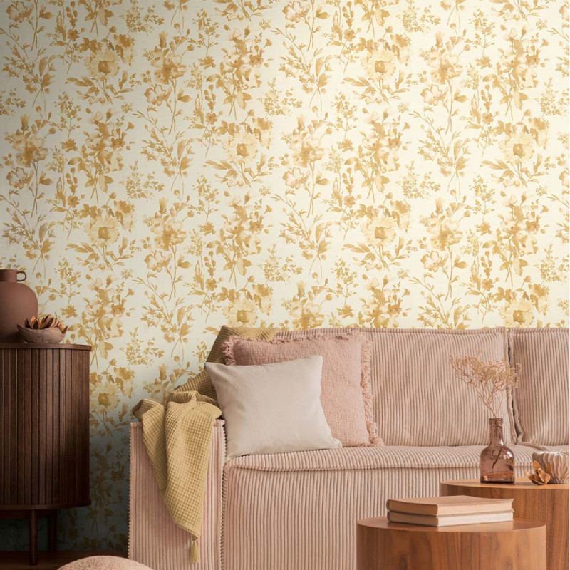 Ce papier peint intissé à motif floral apporte romantisme et élégance à vos intérieurs grâce à ses impressions florales intemporelles. Les fleurs aquarellées roses revêtues d'or sur fond paille créent une ambiance chic et raffinée qui redonne cachet et style à l'ensemble de vos pièces.