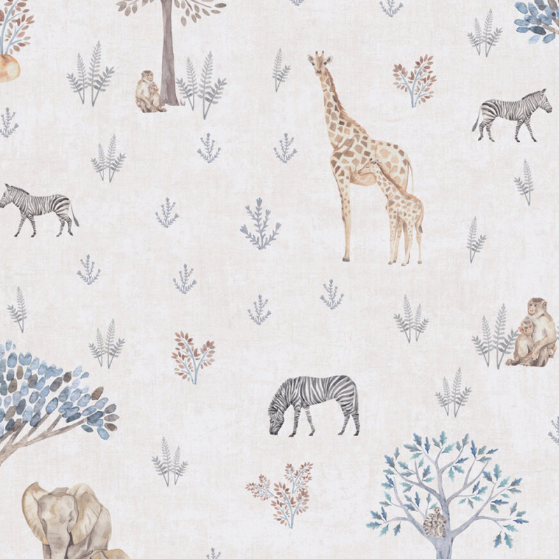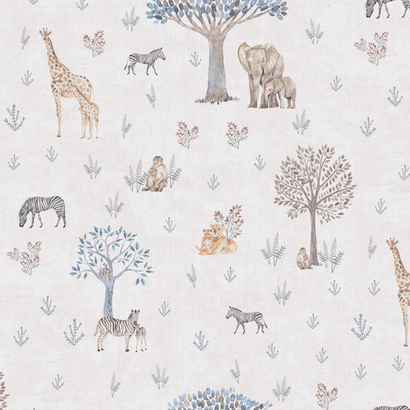 Le papier peint intissé Savane beige AS CRÉATION met en scène les animaux emblématiques de la savane, tels que la girafe, le zèbre... Le mélange de végétation et d'animaux habille instantanément une pièce. L’ensemble est réalisé sur un fond écru, ce qui confère de la douceur à une chambre d’enfant ou une salle de jeux par exemple.
