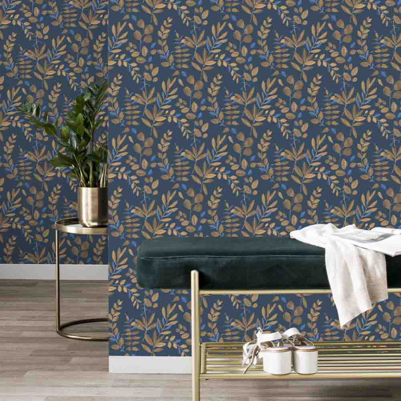 Papier peint intissé botanique ocre et bleu