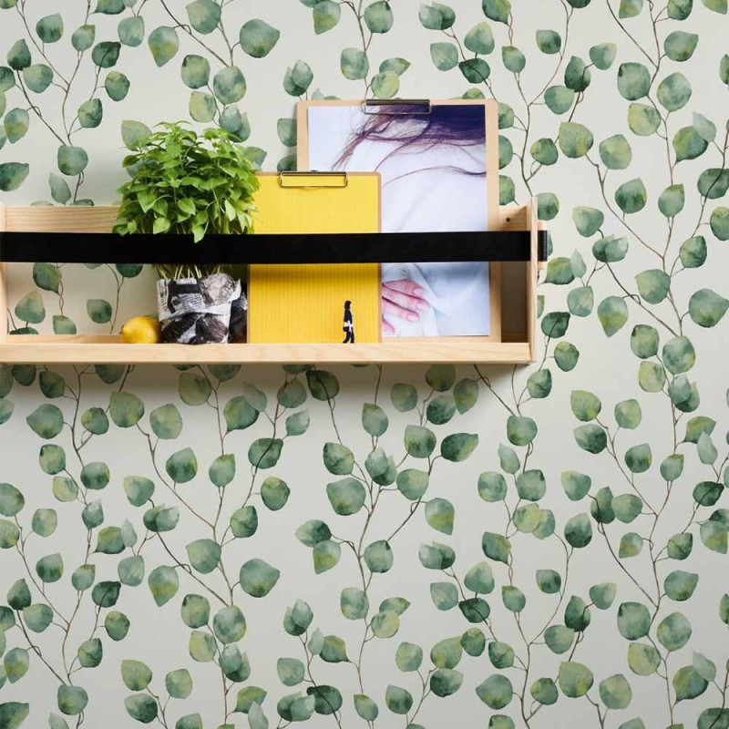 Apportez une touche de sérénité et de nature à votre intérieur avec le papier peint intissé pré-encollé eucalyptus beige...