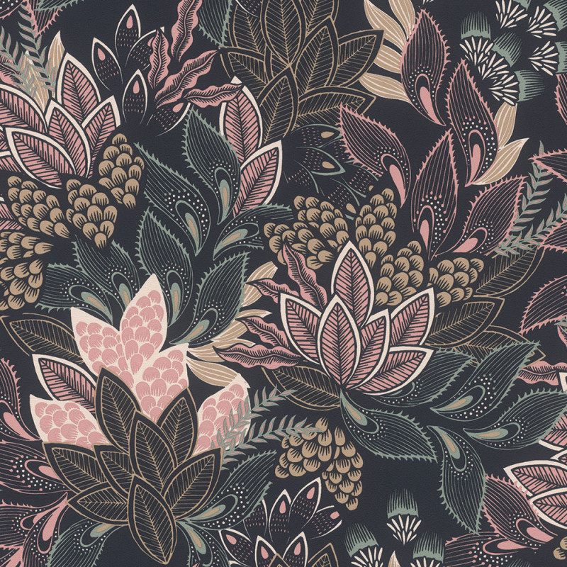 Le Papier Peint Léa Rose Noire RASCH transforme votre intérieur en un cocon de gaieté et de fantaisie. Des feuilles aux formes originales, dans des teintes blanches, beiges, roses et vert menthe, contrastent élégamment sur un fond noir texturé. Ce design floral moderne apporte une touche joyeuse et lumineuse à toute pièce, parfaite pour une décoration pleine de charme.