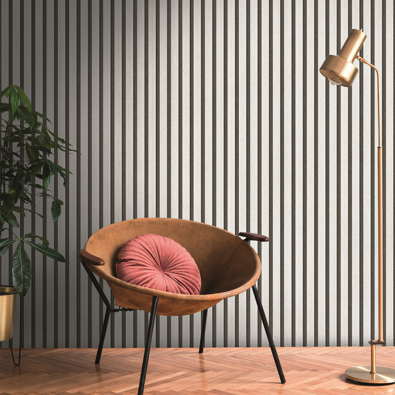 Apportez une note élégante et résolument moderne à vos murs avec le papier peint intissé tasseaux de bois argenté sur...