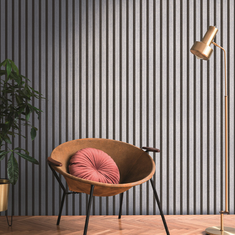 Créez une ambiance contemporaine et raffinée avec le papier peint intissé tasseaux de bois bleu acier...
