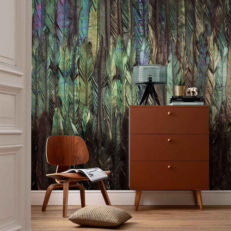 Ajoutez une touche de sophistication à votre espace avec le papier peint panoramique intissé sombre (L200 x H250 cm). Ce papier peint panoramique présente des plumes au réalisme saisissant, dont les reflets captivent la lumière et fascinent le public. Idéal pour les passionnés de décoration créative, ce panoramique ajoute une dimension élégante à votre salon ou un bureau. De plus, l'installation est simple et rapide, même pour un débutant !