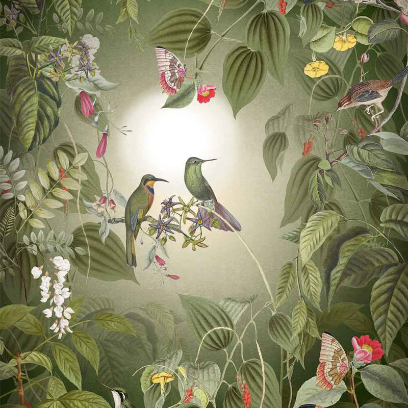 Papier peint panoramique intissé végétal et oiseau vert L200 x H250 cm