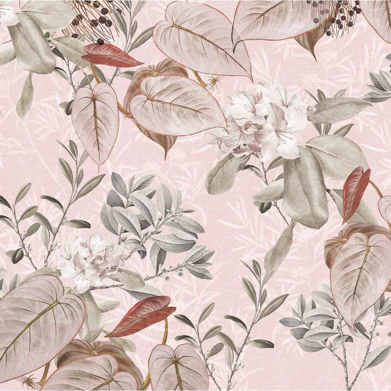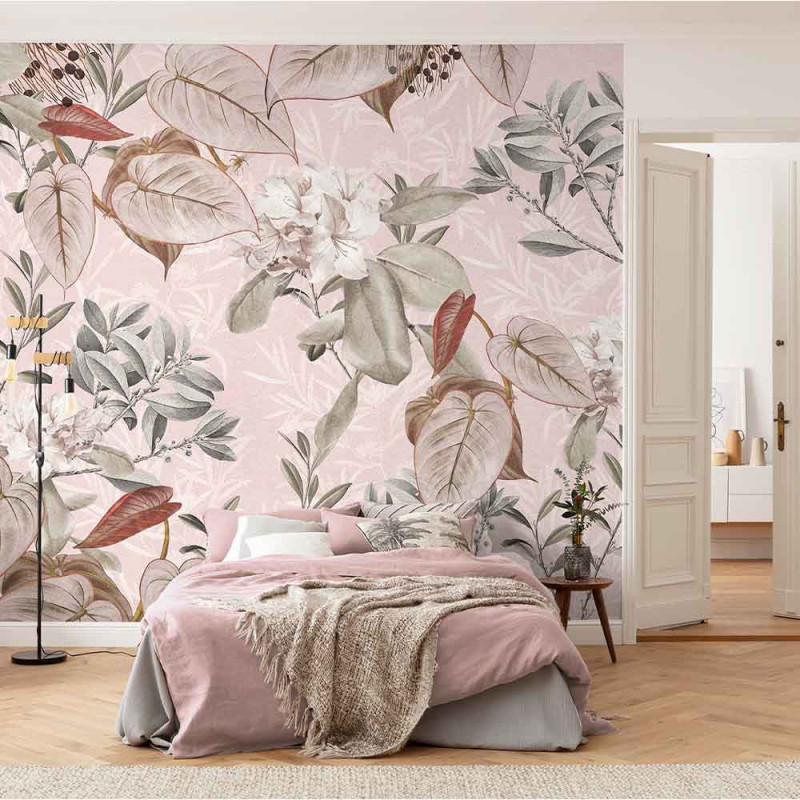 Papier peint panoramique intissé feuillage rose L350 x H250 cm