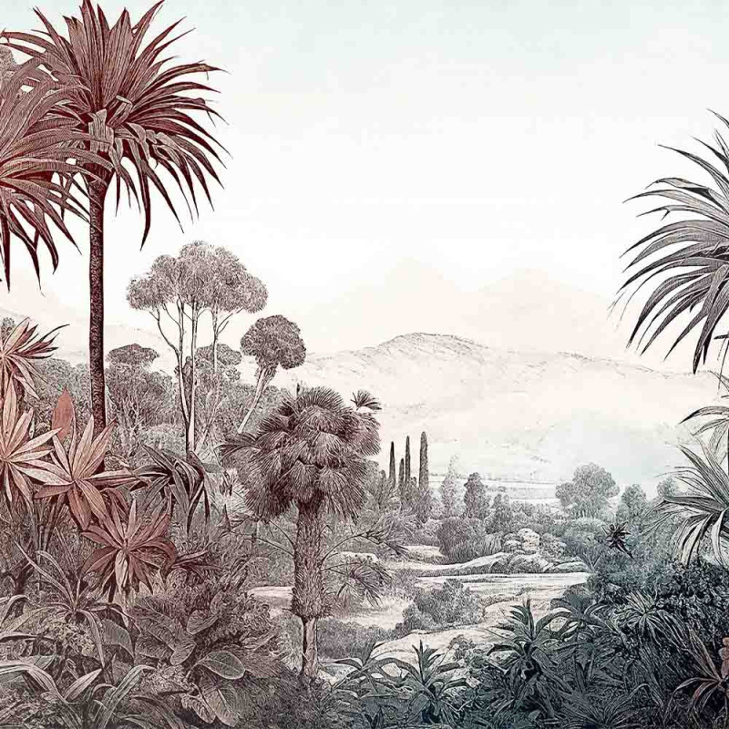 Apportez une sensation de calme et d'évasion à votre intérieur avec le papier peint panoramique paysage jungle (L371 x H280 cm). Ce décor mural, parfait pour une salle de séjour, une chambre ou un espace de travail, crée une ambiance sereine et naturelle. Les palmiers et pins aux teintes de vert, d'ocre et de gris se mêlent harmonieusement à l'esquisse vaporeuse des montagnes et au ciel aquarellé légèrement bleuté. Cette composition captivante transforme votre mur en une véritable œuvre d'art vivante, apportant une atmosphère apaisante et inspirante à votre espace. Panoramique en 7 lés, il offre profondeur et beauté à toute pièce.