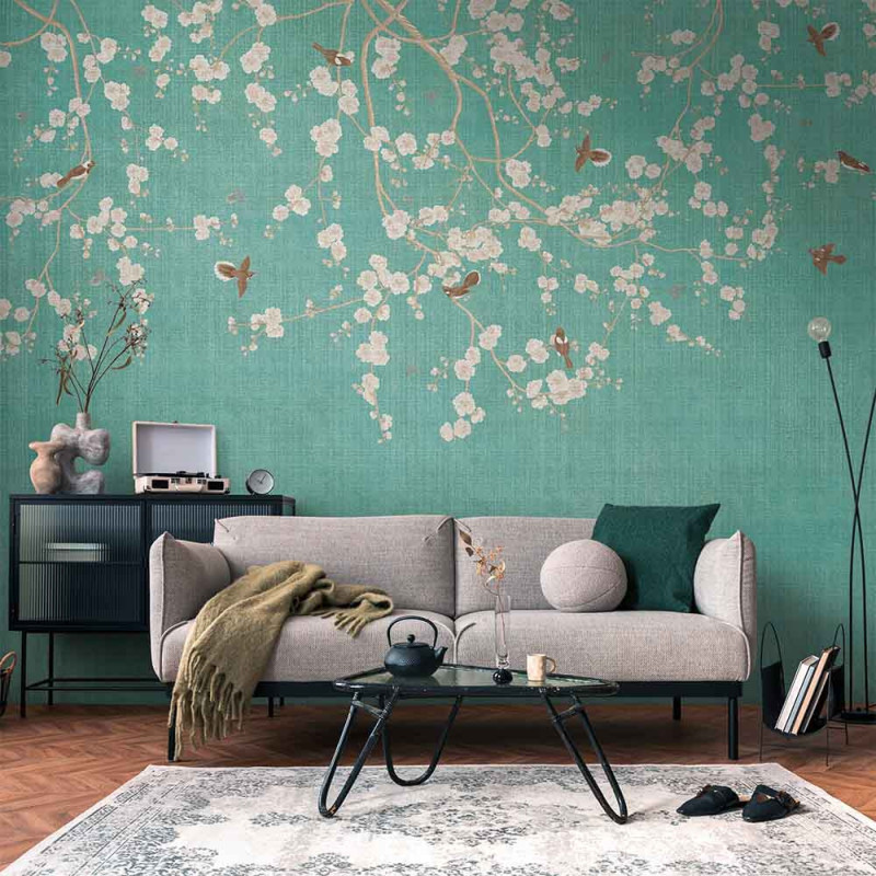 Papier peint panoramique intissé oiseaux bleu 371L x 280H cm