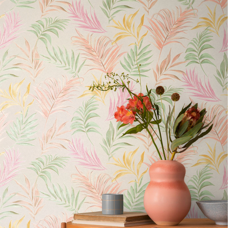 Ce papier peint intissé à motif palmettes multicolores donne vie et lumière à votre intérieur. Les palmettes irisées roses, saumonées et vertes créent un décor aérien et captivant dont on ne peut se lasser. Ces motifs semblent jouer entre eux pour offrir une composition harmonieuse et poétique.
