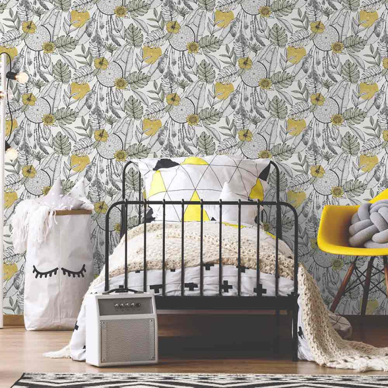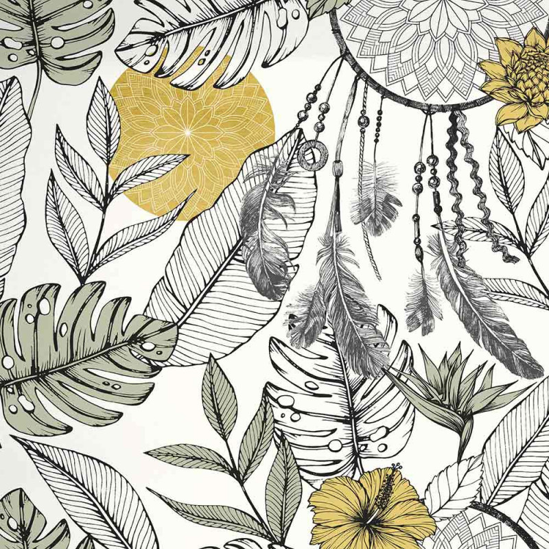 Papier peint intissé motif végétal et attrape rêve. Nouvelle génération de papier peint, l'intissé vous permettra de décorer un pan de mur ou toute une pièce très rapidement et sans effort. L'intissé se découpe au cutter sans se déchirer. Plus besoin d'appliquer de la colle au dos du papier : la colle est à appliquer uniquement sur le mur, au rouleau et au pinceau pour les angles. Plus besoin donc de table à tapisser. Le papier peint adhère sur le mur facilement et sans se déchirer au contact de la colle. Fabriqué en Union Européenne. Ce papier peint est lessivable donc il convient particulièrement aux pièces à vivre.