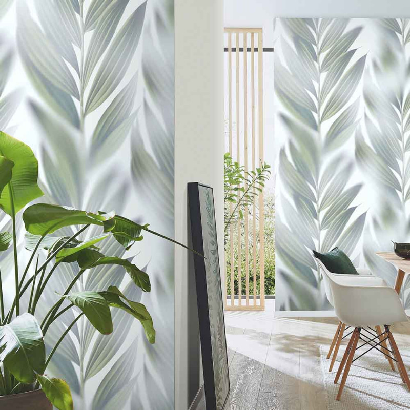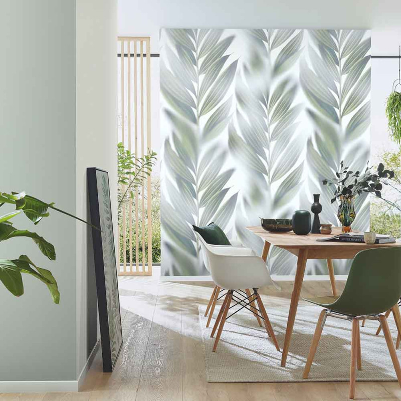 Le papier peint panoramique intissé feuillage flou vert et blanc ERISMANN, mesurant L 150 x H 270 cm, et transforme...