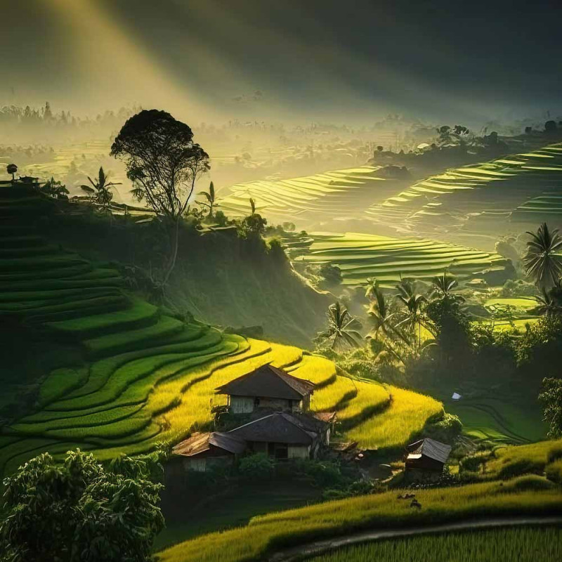Plongez dans la beauté naturelle avec le papier peint panoramique intissé Rizières Java vert d'Erismann, mesurant L 150...