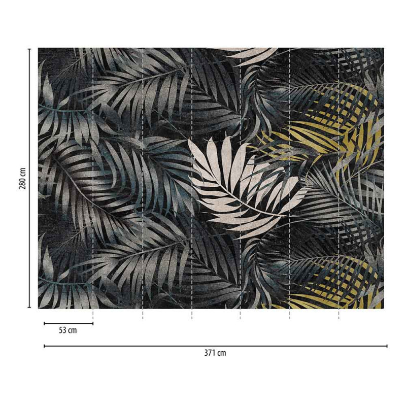 Apportez une note d'élégance à votre espace avec le papier peint panoramique en vinyle végétal noir AS CREATION. Avec des dimensions de 371 cm de largeur sur 280 cm de hauteur, ce revêtement mural met en avant de grandes palmes dégradées en nuances de gris bleuté et touches de vert, créant un contraste chic sur fond noir. Composé de sept lés panoramiques, il transforme votre pièce en un véritable écrin de style. Résistant et simple à poser, ce papier peint est idéal pour ceux qui désirent enrichir leur décoration intérieure avec une ambiance moderne et raffinée.