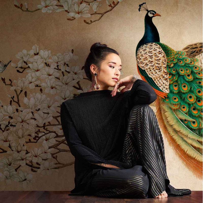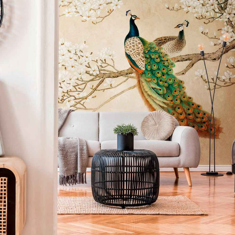 Ajoutez une touche d'exotisme à votre intérieur avec le papier peint panoramique paon fleur de cerisier beige AS...