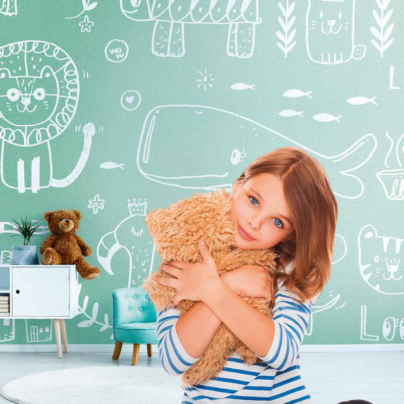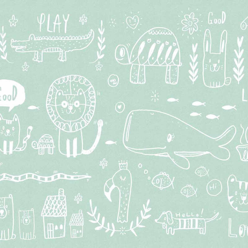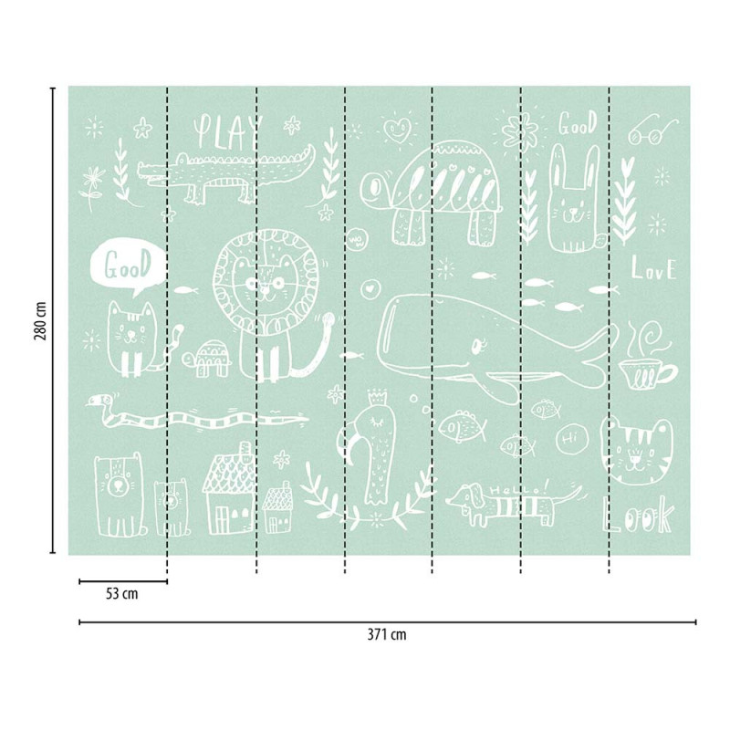 Papier peint panoramique en vinyl sur intissé Animaux à la craie vert sauge 371 H x 280 L cm