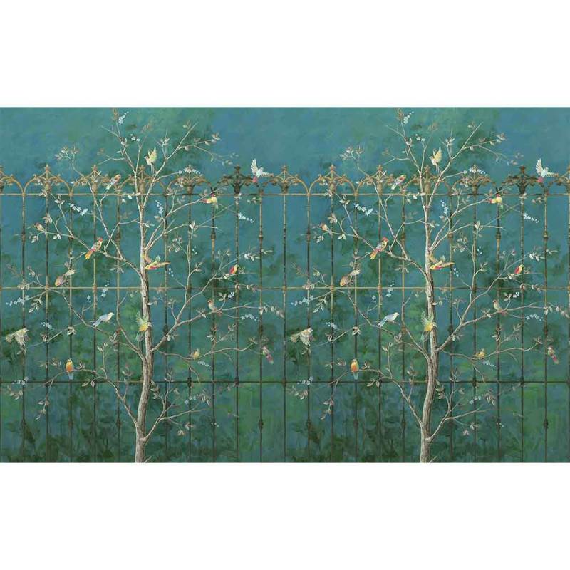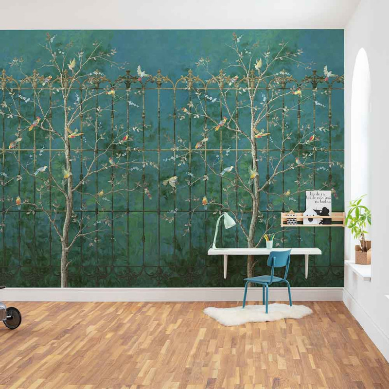 Papier peint panoramique intissé arbre d'oiseaux vert L400 x H250 cm