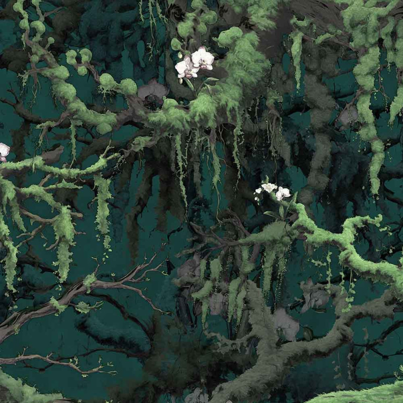 Ce revêtement panoramique intissé avec un motif d'orchidée vert émeraude, transforme votre espace en un havre de paix empreint de mystère. Les branches recouvertes de mousse s'étendent gracieusement sur la surface, plongeant la pièce dans un vert foncé captivant qui évoque la beauté naturelle. Cette décoration murale impressionnante diffuse une atmosphère apaisante et immersive, apportant le rayonnement profond de la nature directement dans votre maison. Idéal pour les salons, les chambres ou les espaces de détente, ce papier peint crée un environnement serein et élégant. Il est très facile à poser grâce à son intissé, il offre une solution pratique pour embellir instantanément votre intérieur et créer une ambiance chaleureuse et inspirante.