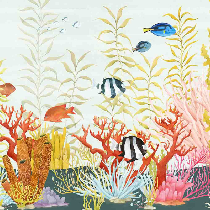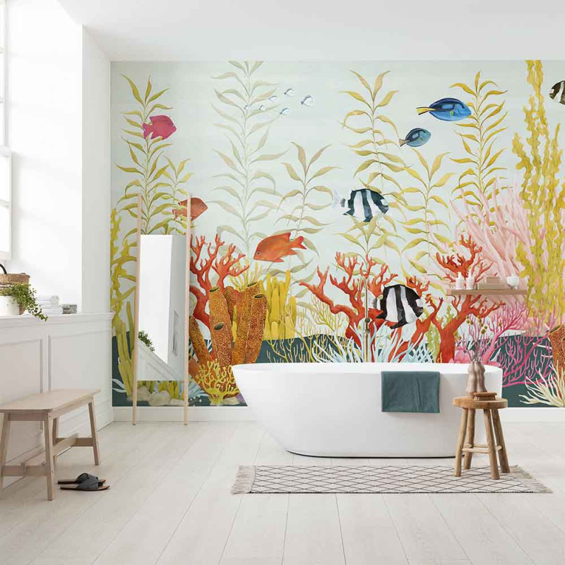 Plongez dans un univers sous-marin vibrant avec le papier peint panoramique intissé corail multicolore, mesurant 350 cm...