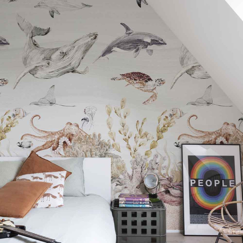 Apportez une ambiance apaisante et rafraîchissante à votre intérieur avec le papier peint panoramique intissé vie marine à l'aquarelle...