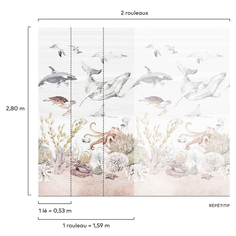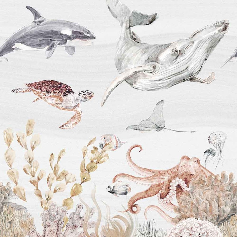 Papier peint panoramique intissé vie marine à l'aquarelle L159 x 280H cm