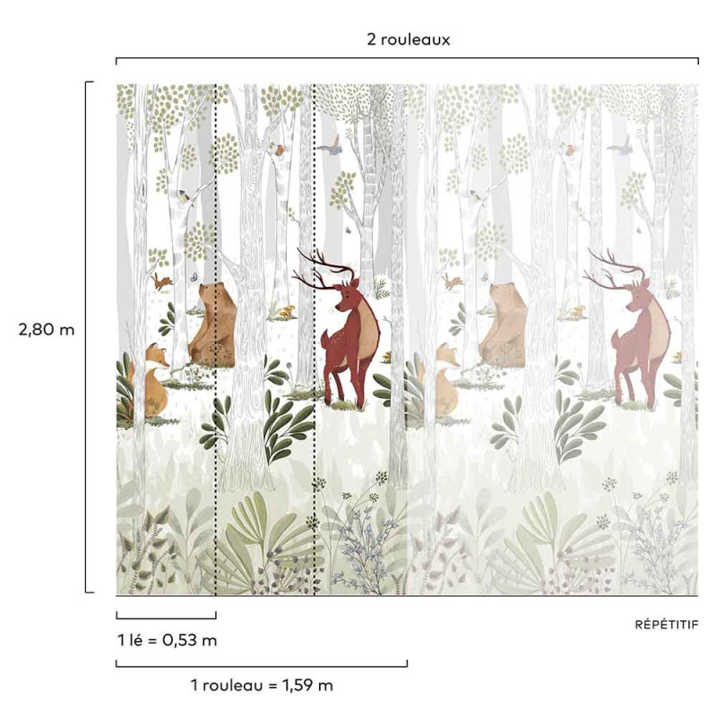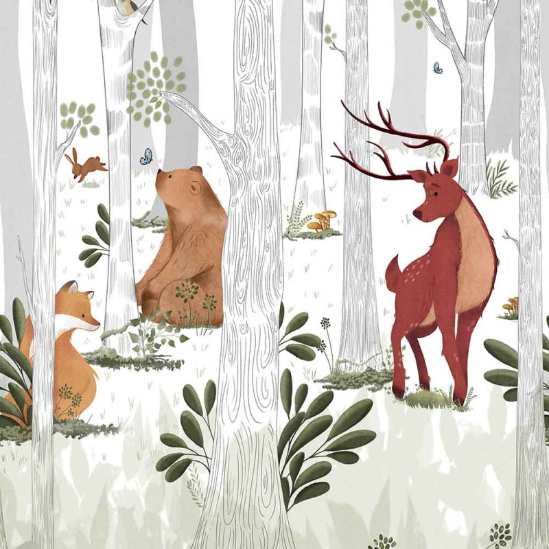Papier peint panoramique intissé forêt d'animaux beige L159 x 280H cm