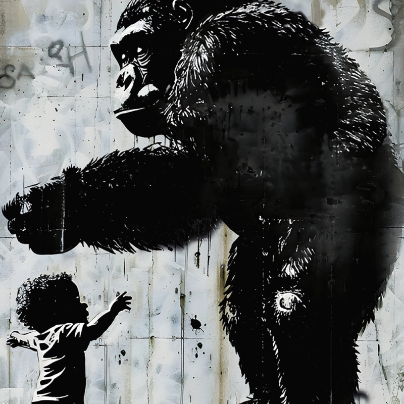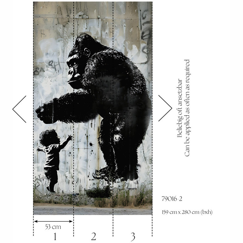 Ce papier peint panoramique saisissant présente un gorille imposant tendant la main vers un petit enfant, le tout sur un fond de mur urbain en béton orné de graffitis. La scène allie puissance et tendresse, illustrant la connexion entre la nature sauvage et l’innocence de l’enfance. Le fond urbain avec des touches de graffiti apporte une touche contemporaine, créant un contraste frappant avec les figures centrales. Ce décor mural unique confère profondeur et émotion à l’espace, capturant l'attention tout en abordant les thèmes de la coexistence et de l'harmonie.