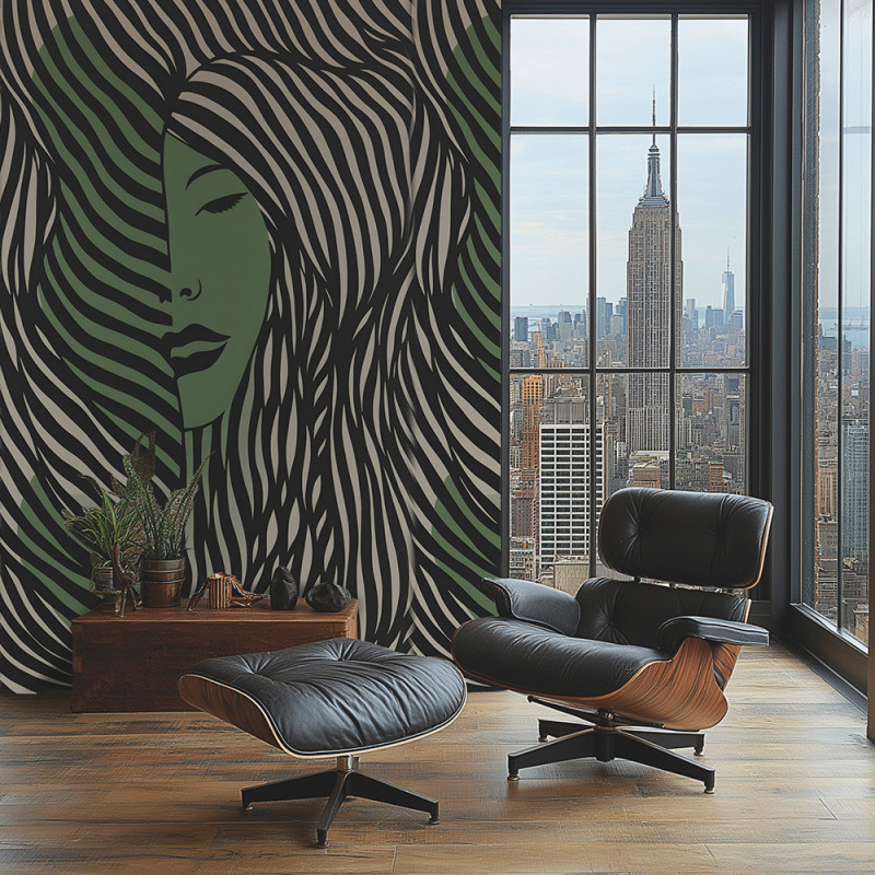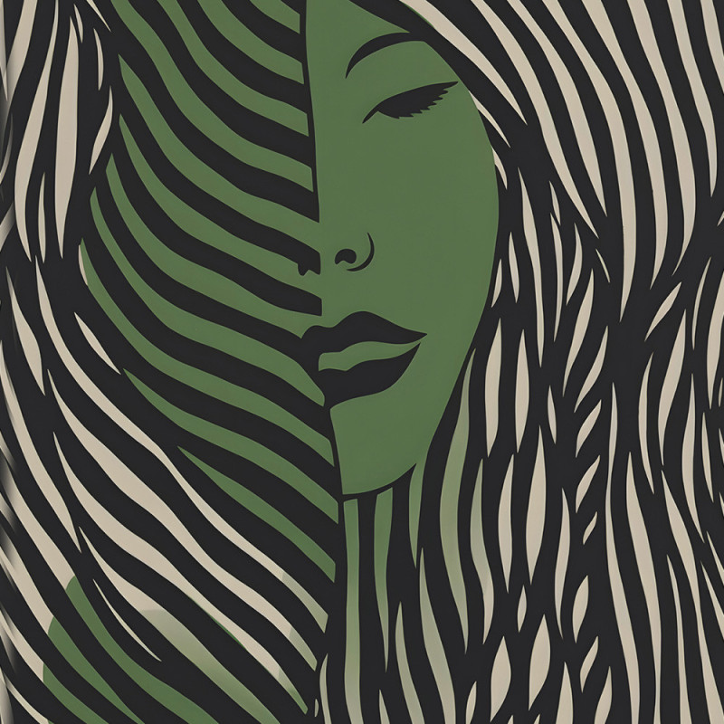 Ce papier peint panoramique saisissant présente une immense chevelure zébrée de beige et de noir, encadrant un visage féminin d'une teinte verte unique. Les motifs contrastés de la chevelure créent un effet visuel captivant, attirant immédiatement l'attention. Le visage vert, à l'apparence surréaliste, ajoute une dimension intrigante et originale à l'ensemble, évoquant des thèmes de mystère et d'art moderne. Ce décor mural confère à l'espace une esthétique unique, transformant votre mur en une véritable œuvre d'art qui invite à la contemplation et à l'interprétation personnelle.