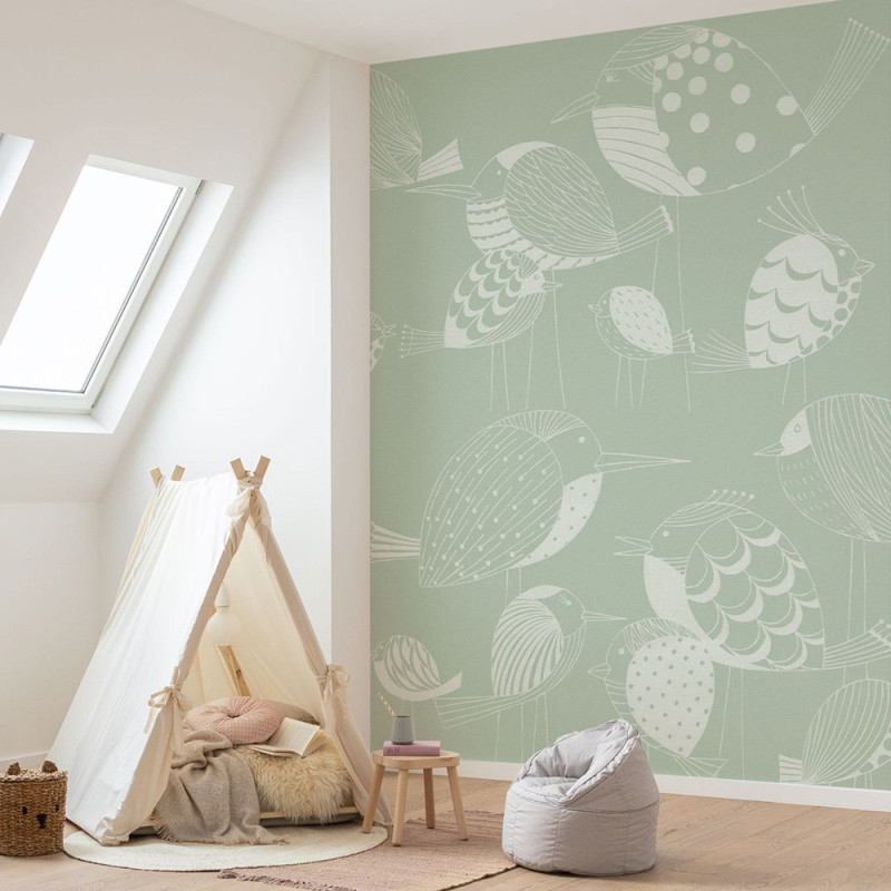 Le papier peint panoramique intissé Naive Birds de KOMAR (200 x 250 cm) invite la nature dans la maison avec douceur et poésie. Ses grandes illustrations d’oiseaux, dessinées dans un style naïf et enfantin, apportent une note joyeuse et chaleureuse à la décoration. Le fond vert tilleul équilibre l’ensemble et crée une atmosphère apaisante et harmonieuse, idéale pour une pièce à vivre ou un espace plus calme. À retrouver dans notre sélection de papier peint panoramique nature.