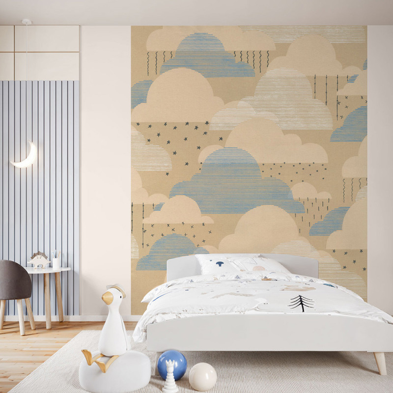 Le papier peint Happy Clouds de KOMAR (200 x 250 cm) enveloppe la pièce d’une ambiance douce et rassurante. Les nuages aux tons beige et bleu, accompagnés de fines lignes, de petites étoiles et de gouttes de pluie esquissées, composent un univers poétique plein de légèreté. Ce panoramique crée un cadre propice au calme, à la détente et au rêve, parfaitement adapté à une chambre d’enfant. Une décoration murale apaisante qui invite à la sérénité dès le premier regard. À découvrir dans notre univers papier peint chambre enfant.