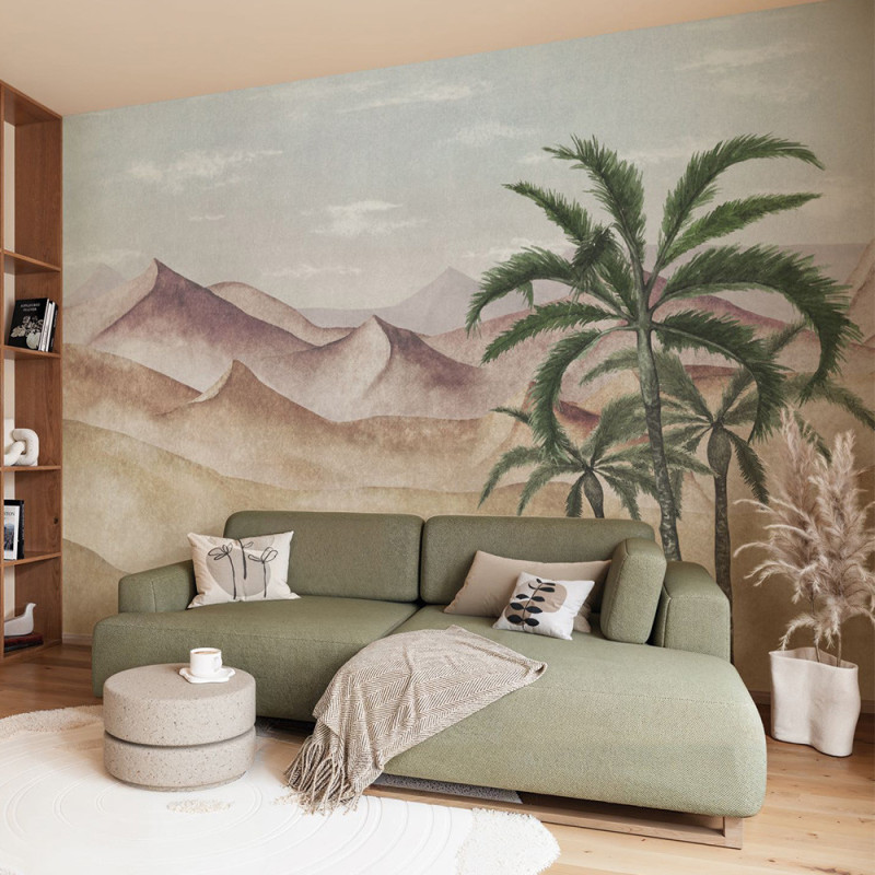Le papier peint panoramique intissé Silent Sands de KOMAR (350 x 250 cm) transforme votre mur en paysage désertique apaisant. Les collines arrondies et palmiers stylisés, déclinés dans des tons sable, ocre et rose, créent calme et sérénité tout en offrant une profondeur visuelle harmonieuse. Inspiré d’illustrations à l’aquarelle, ce panoramique révèle des dégradés subtils et des détails fins, apportant une touche artistique et picturale à votre intérieur. À découvrir dans notre collection papier peint panoramique trompe-l’œil et paysage.
