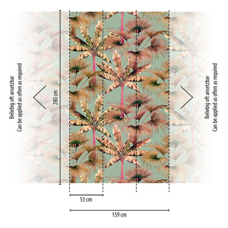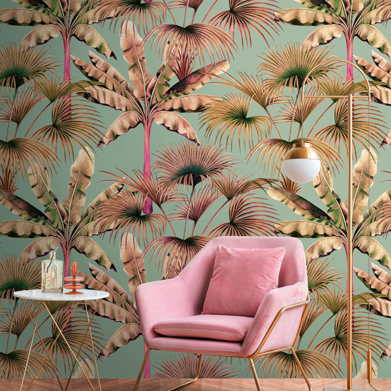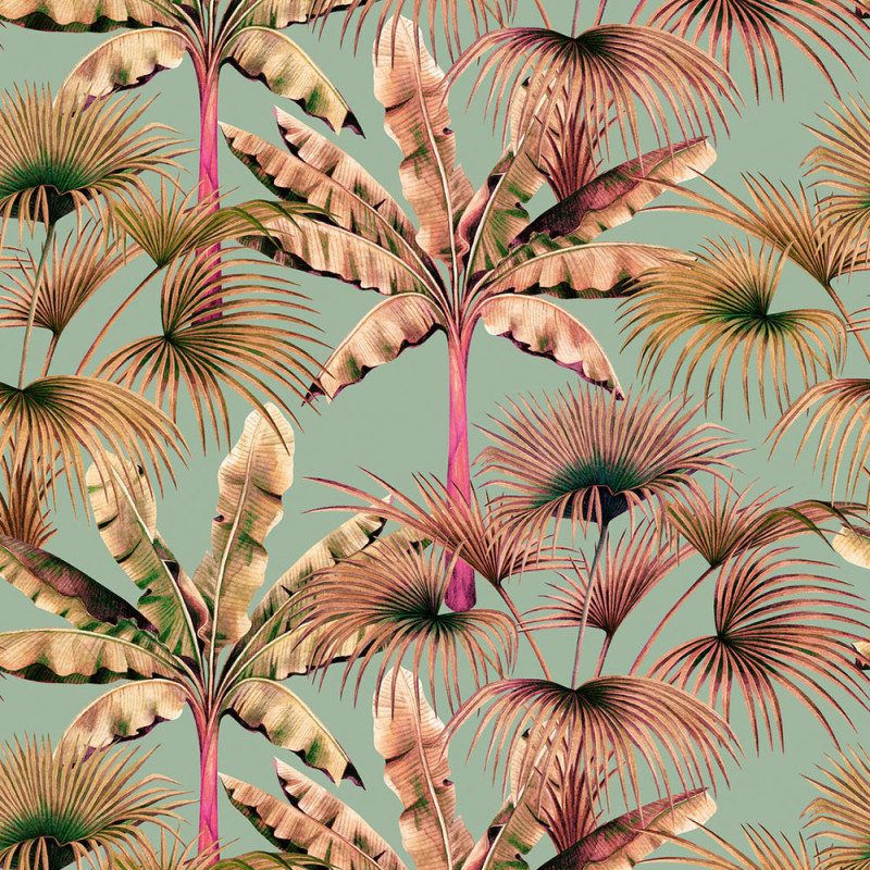 Transformez votre intérieur avec ce papier peint panoramique pas cher Les Miami Rose Pastel d’AS Creation. Ses palmiers aux teintes mordorées et rosées se dressent avec élégance sur un fond vert, créant un contraste raffiné qui évoque la lumière dorée du couchant à travers une végétation tropicale luxuriante.