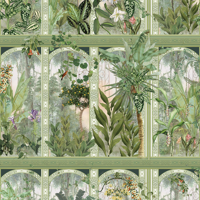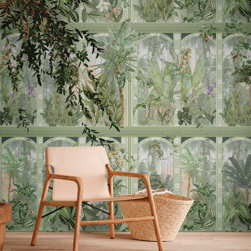 Apportez élégance et exotisme à vos murs avec ce papier peint panoramique pas cher Les Jungles Arch d’AS Creation. Inspiré du style Art déco, ce décor mêle arches vertes juxtaposées et palmiers luxuriants pour créer un rendu graphique et tropical à la fois raffiné et apaisant.