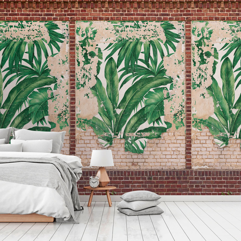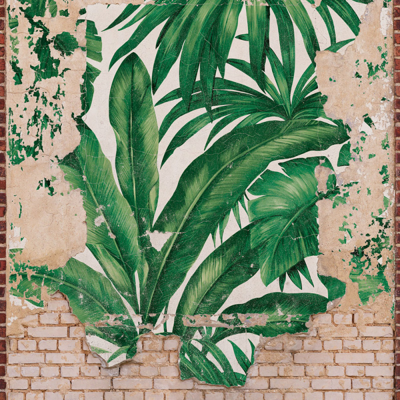 Apportez style urbain et touche naturelle à vos murs avec ce papier peint panoramique pas cher Les Brique et Plâtre Jungle Tag2 d’AS Creation. Un mur de briques anciennes partiellement recouvert de plâtre accueille un tag de grandes feuilles vertes, créant un décor captivant où street art et nature s’harmonisent.