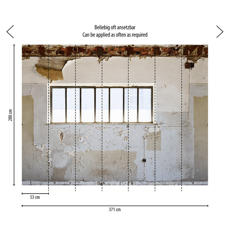 Apportez une ambiance industrielle et authentique à vos murs avec ce papier peint panoramique pas cher Les Plâtres Industrial de AS Creation. Inspiré des ateliers et lofts urbains, ce décor met en scène une fenêtre métallique ouverte sur un mur usé, où la peinture écaillée et les textures patinées créent un effet de relief saisissant et une atmosphère pleine de caractère.