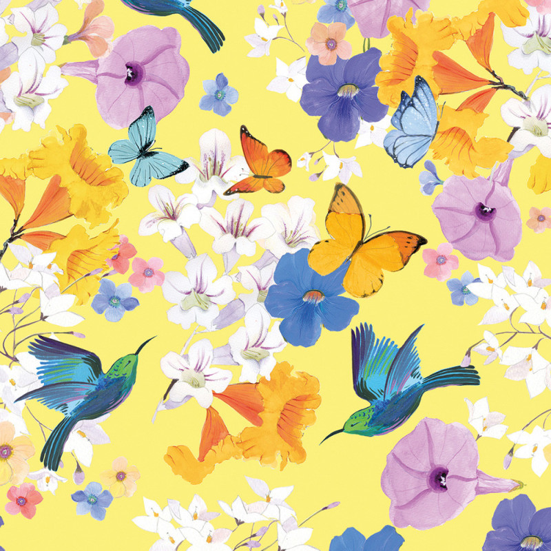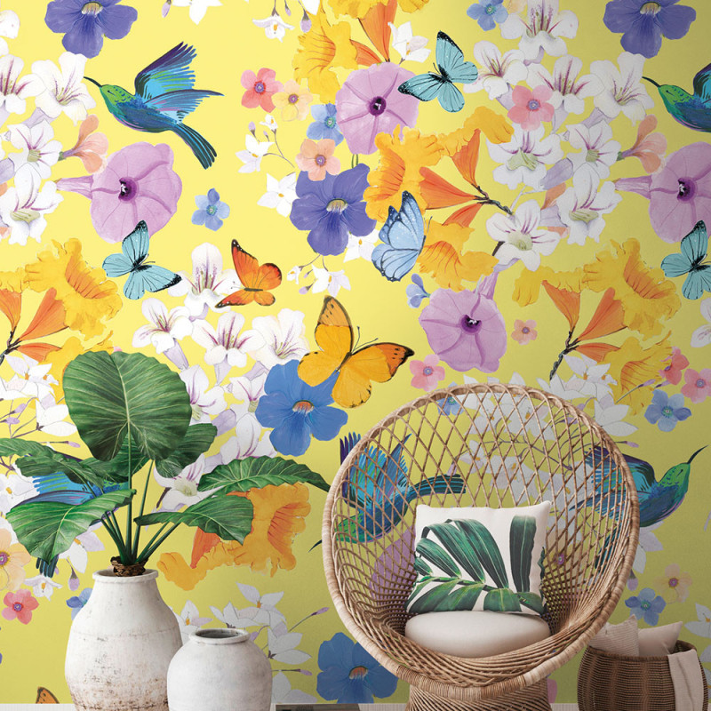 Apportez couleur et dynamisme à vos murs avec ce papier peint panoramique pas cher Les Papillons Jaunes de AS Creation. Son décor lumineux met en scène de grands oiseaux et papillons multicolores sur un fond jaune éclatant, créant une ambiance poétique et estivale dans votre intérieur.
