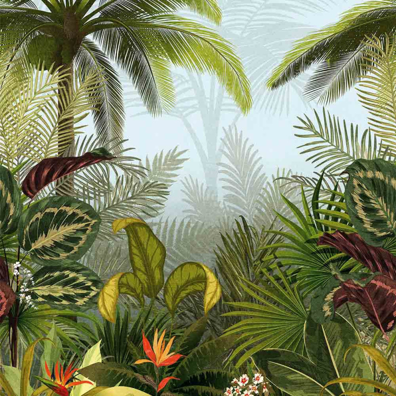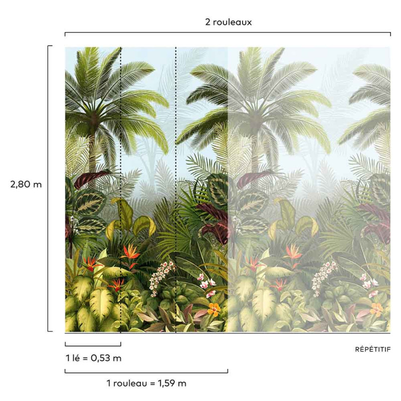 Papier peint panoramique intissé motif Jungle Tropical. Nouvelle génération de papier peint, l'intissé vous permettra de décorer un pan de mur ou toute une pièce très rapidement et sans effort. Votre rouleau est composé de 3 lés de 53 cm de largeur et de 280 cm de hauteur. La largeur totale de votre motif avec un rouleau sera de 159 cm. Vous pouvez bien évidement moduler la largeur de votre motif en fonction de la taille de votre pan de mur. L'intissé se découpe au cutter sans se déchirer. Plus besoin d'appliquer de la colle au dos du papier : la colle est à appliquer uniquement sur le mur, au rouleau et au pinceau pour les angles. Plus besoin donc de table à tapisser. Le papier peint adhère sur le mur facilement et sans se déchirer au contact de la colle. Facile d'entretien. Nettoyage avec une éponge humide à l’eau savonneuse.