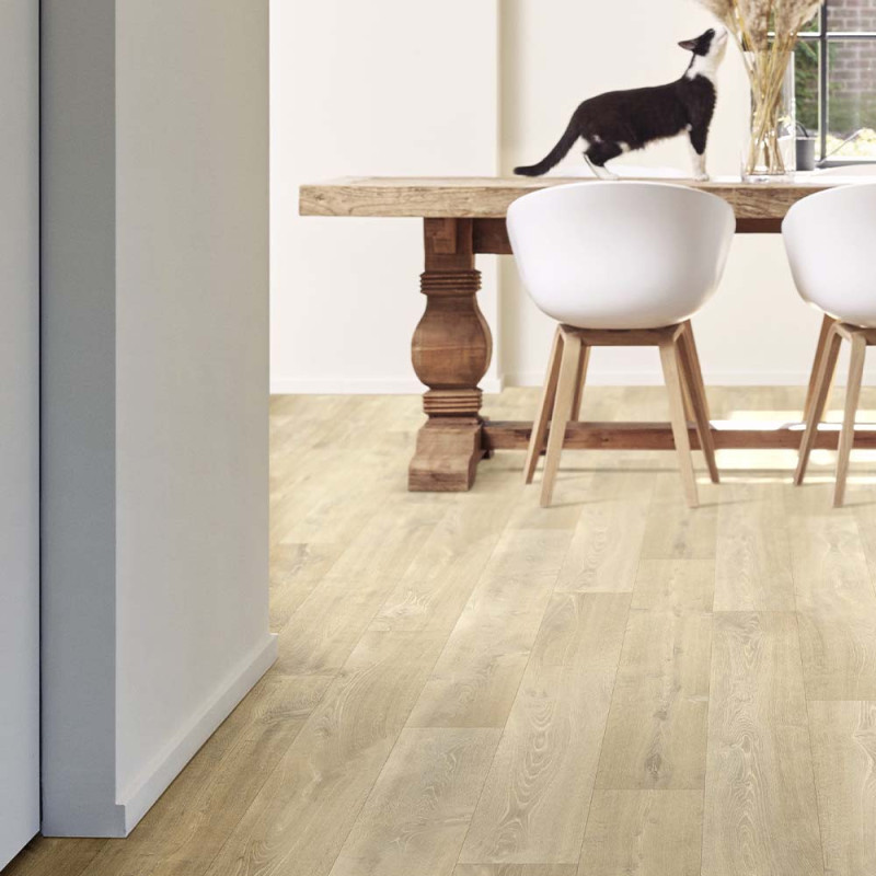 Ce revêtement de sol PVC support feutre décor chêne clair offre une excellente tenue dans le temps grâce à son épaisseur de 2,50 mm. Le support feutre ne nécessite pas de préparation préalable du sol et permet une pose simple, avec la possibilité d’une installation sans colle. Les sons sont amortis, la sensation de douceur et le confort à la marche sont inégalés, pour un usage quotidien agréable. Doté d’un traitement antitache, ce sol PVC garantit un entretien très facile. Son style complète parfaitement n’importe quelle pièce, qu’elle soit traditionnelle ou contemporaine, tout en étant parfaitement adapté à un passage intensif grâce à sa robustesse et sa durabilité.